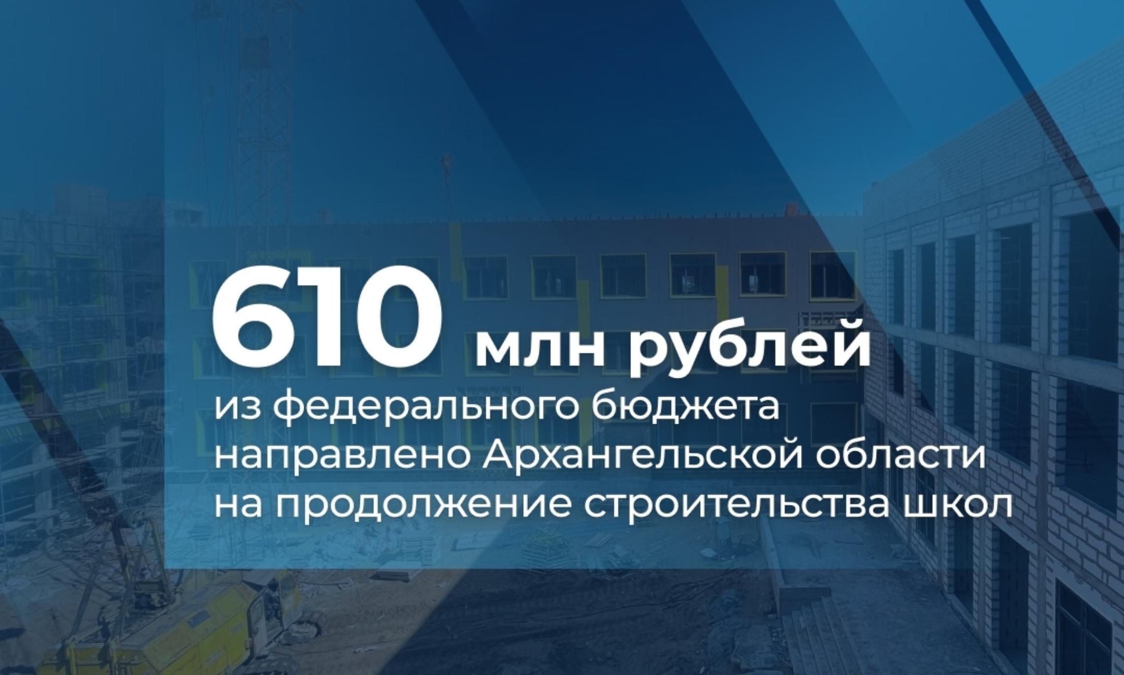 Правительство РФ выделило Архангельской области дополнительное финансирование на завершение строительства четырёх новых школ. Соответствующее распоряжение подписал Председатель Правительства Михаил Мишустин. Средства в размере 610 миллионов рублей будут направлены
