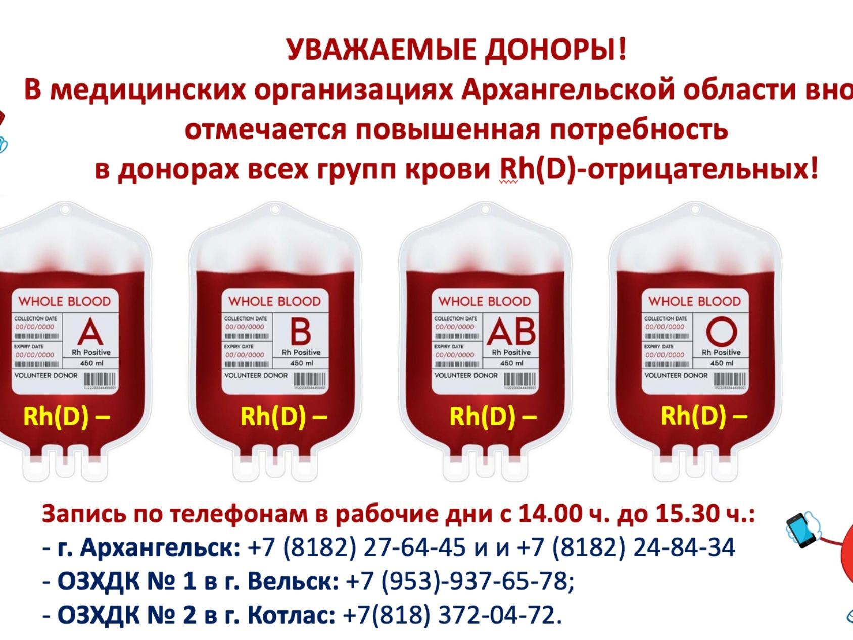 В медицинских организациях Архангельской области отмечается повышенная потребность в донорах всех групп крови с Rh отрицательным фактором. По словам специалистов, запасы компонентов крови с отрицательным резус-фактором необходимо регулярно